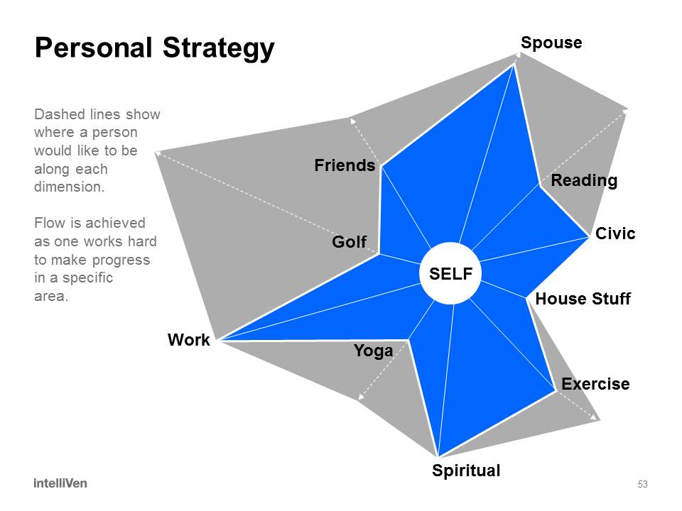 - Concentrate on one or two or three for a specific period and then switch to another one or two at another time as feels appropriate. E.g., in your mid-20s to late 30s you may focus on career and family then, in your 50s and 60s, work on travel, health and handicap.
